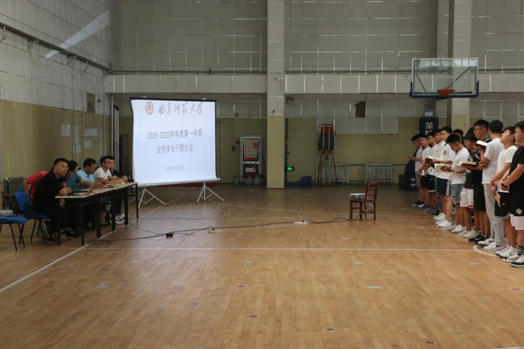 新球馆召开了2019—2020学年度第一学期全院学生干部大会。本次大会由团委书记梁贺涵主持,党委副书记展利民、辅导员刘京、辅导员唐海峰、各班级班主任、班主任助理及全院主要学生干部共同参加了此次大会。