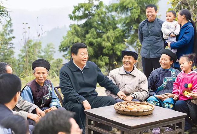 在湘西州花垣县排碧乡十八洞村,习近平到苗族贫困村民施齐文家中看望,坐下来同一家人算收支账,询问有什么困难、有什么打算,察看了他家的谷仓、床铺、灶房、猪圈,勉励一家人增强信心,在党和政府关心下用勤劳和智慧创造美好生活。