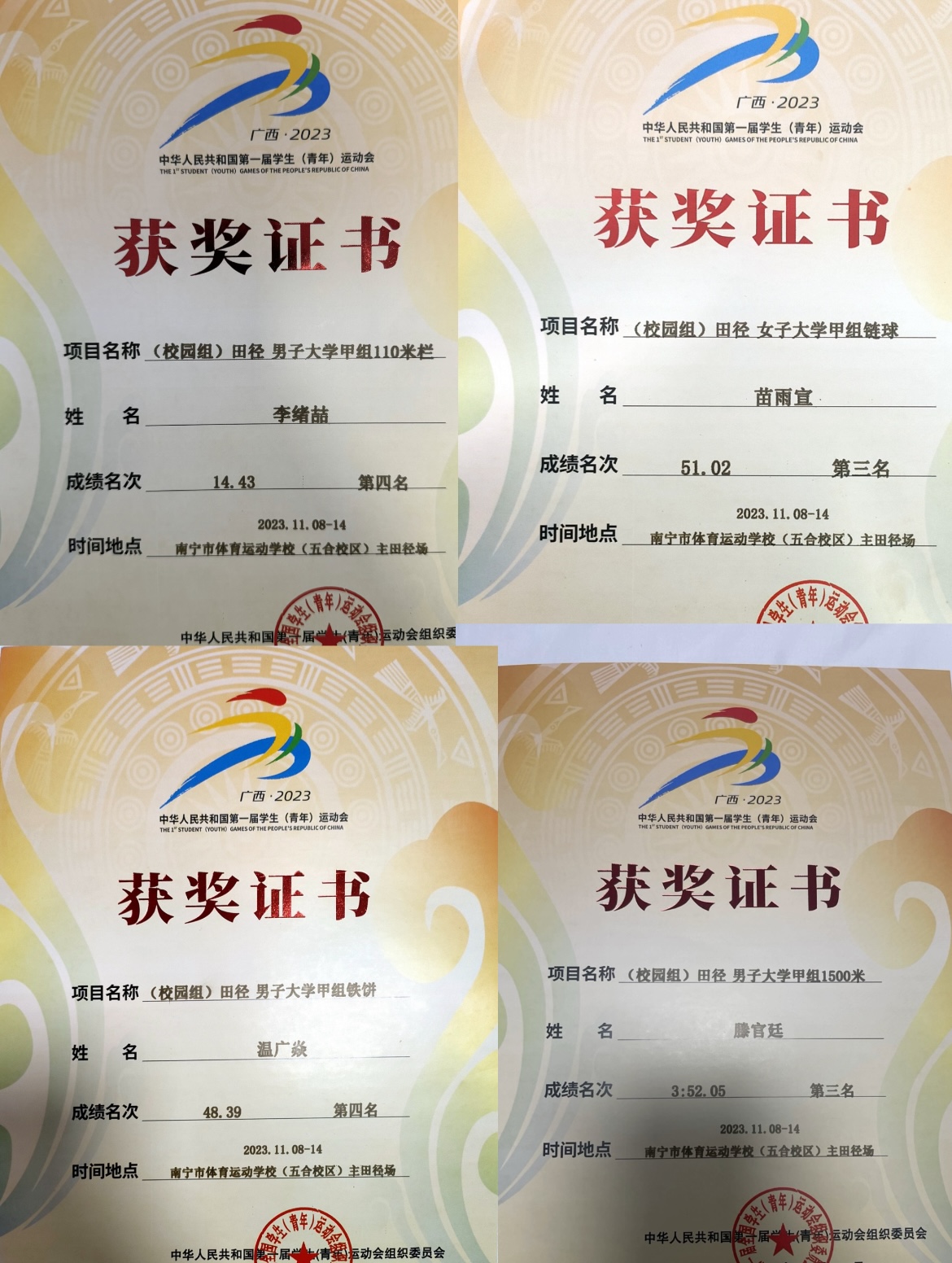 在本次比赛中,2021级运动训练专业学生苗雨宣获大学甲组女子链球铜牌;2021级运动训练专业学生滕官廷获大学甲组男子1500米铜牌;2022级运动训练专业学生盖巧慧获得大学乙组女子标枪铜牌;2020级体育教育(师范M)专业学生李绪喆获大学甲组男子110米栏第四名(山东田径大学甲组直道项目唯一名次);2020级运动训练专业学生温广焱获大学甲组男子铁饼第四名;2020级运动训练专业学生张瑞琦获大学乙组女子跳高第四名。