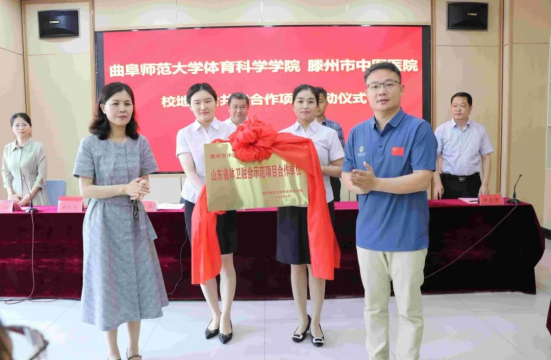 山东省体卫融合试点项目负责人朱磊和卫生健康局二级主任科员颜红菊为滕州市中医医院授予山东省体卫融合示范项目合作单位揭牌。