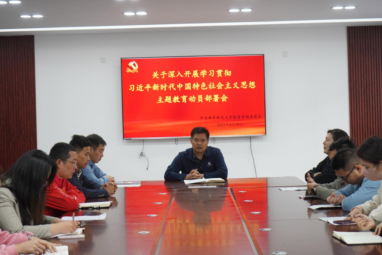 相关工作安排,2023年4月19日,体育学部召开关于深入开展学习贯彻习近平新时代中国特色社会主义思想主题教育动员部署会。体育学部领导班子成员、各党支部书记及支委会委员参加会议,会议由体育学部党委副书记马振华主持。