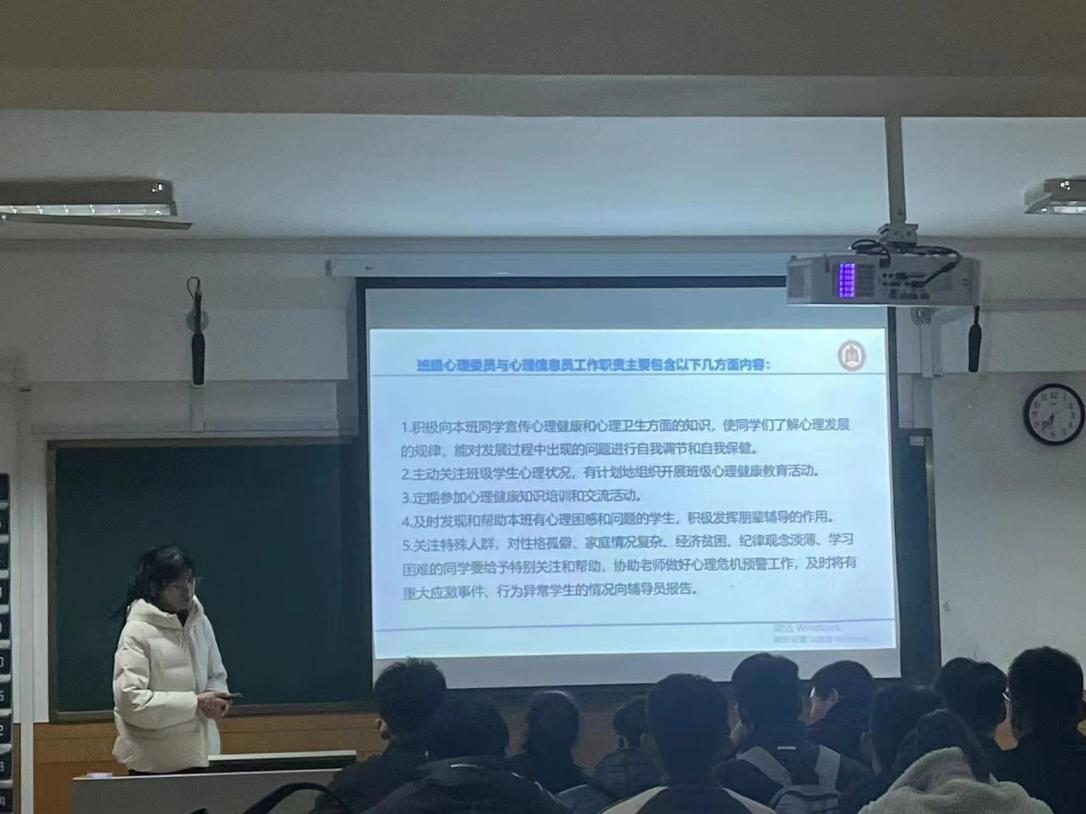 心理辅导员王冰在体育楼110教室开展班级心理委员与宿舍心理信息员培训。