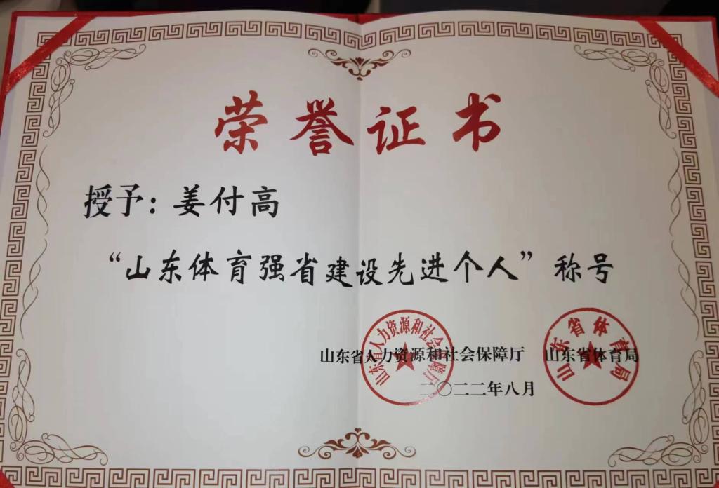 院长姜付高教授被授予“山东省体育强省建设先进个人”荣誉称号。本次表彰活动对2018-2021年度在全省群众体育工作中表现突出的集体和个人进行表彰。全省共有20个突出贡献、116个先进集体、124名先进个人受到表彰,其中,全省共有6名高校教师受到表彰。这是首次山东省对体育强省建设先进集体和个人进行表彰。