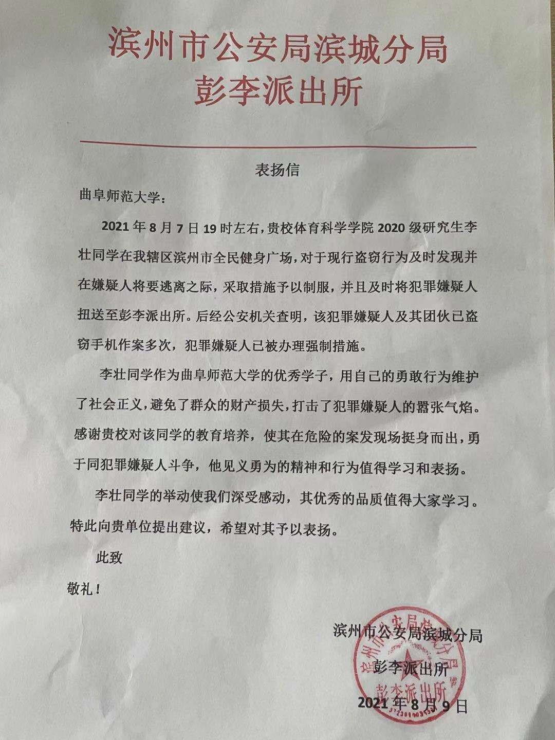 20级研究生李壮同学在滨州市全民健身广场与朋友打球时,发现有小偷在其他场地盗窃他人手机,随即打电话报警。当警察赶到现场时,嫌疑人发现情况不对,欲骑电车准备逃离,随即李壮同学与一块打球的朋友采取措施予以制服,并且及时将犯罪嫌疑人扭送至彭李派出所。事后滨州市公安局滨城分局彭李派出所特意发来表扬信,表达了对李壮同学见义勇为、敢于同犯罪嫌疑人斗争的行为及其优良品质的赞扬。