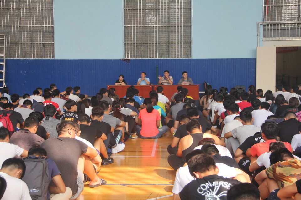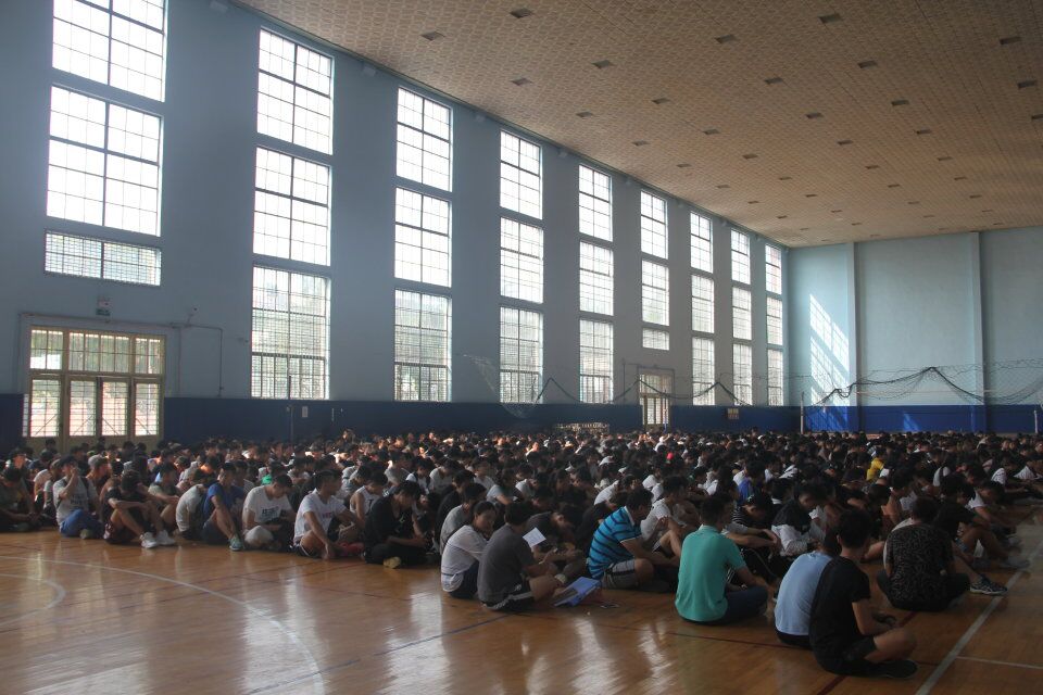 于院楼篮球馆内举行全体学生会议。出席此次会议的成员有党委副书记展利民,团委书记赵峰,辅导员梁贺涵及2014级,2015级与2016级全体同学。