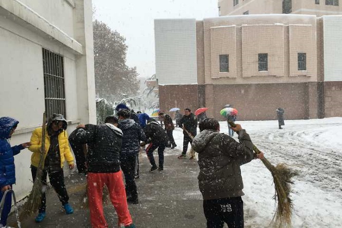 党总支副书记展利民、团总支书记赵峰、辅导员老师梁贺涵和同学们冒着严寒,拿起清扫工具奋力清理积雪。持续飘洒的雪花,凛冽的北风,增加了除雪的难度。师生们的手和脸都冻得通红,身上披着一层雪花,头发被雪水和汗水浸湿,但这丝毫没有影响大家的工作热情和效率。师生们团结协作,经过三个多小时的奋战,体育楼前至田径场、楼东侧的人行道积雪已被清理干净。25日上午,展书记、赵书记和梁老师又带领同学们将亚洲杯决赛直播