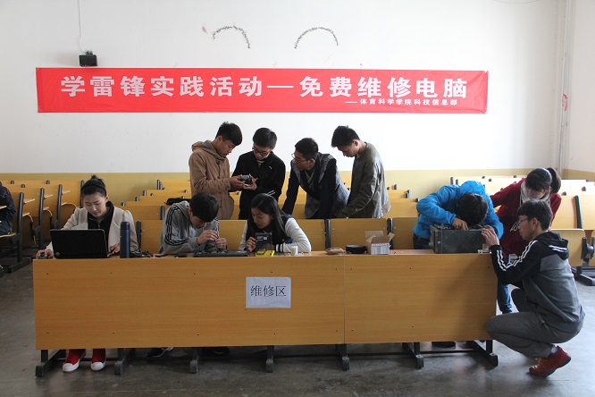 老师、同学检查维修电脑。科技信息部负责为亚洲杯决赛直播