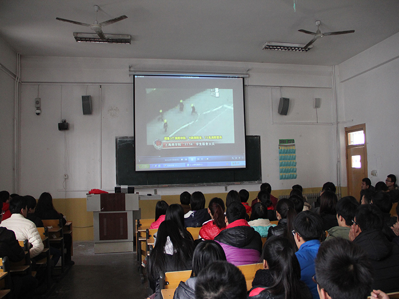 202教室组织学生观看安全教育宣传片。宣传片引用近几年国内外四所大学学生宿舍的火灾案列,向同学们揭示了宿舍火灾的严重性和危害性,同时科学系统地介绍了宿舍火灾的起因、过程及面对火灾的自救方法。