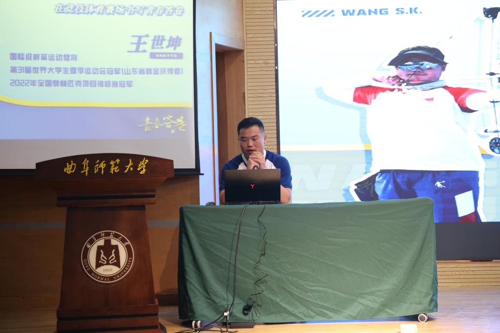 2022级硕士研究生王世坤,作“志存高远,脚踏实地,在竞技体育赛场书写青春答卷”报告会。报告会由亚洲杯决赛直播