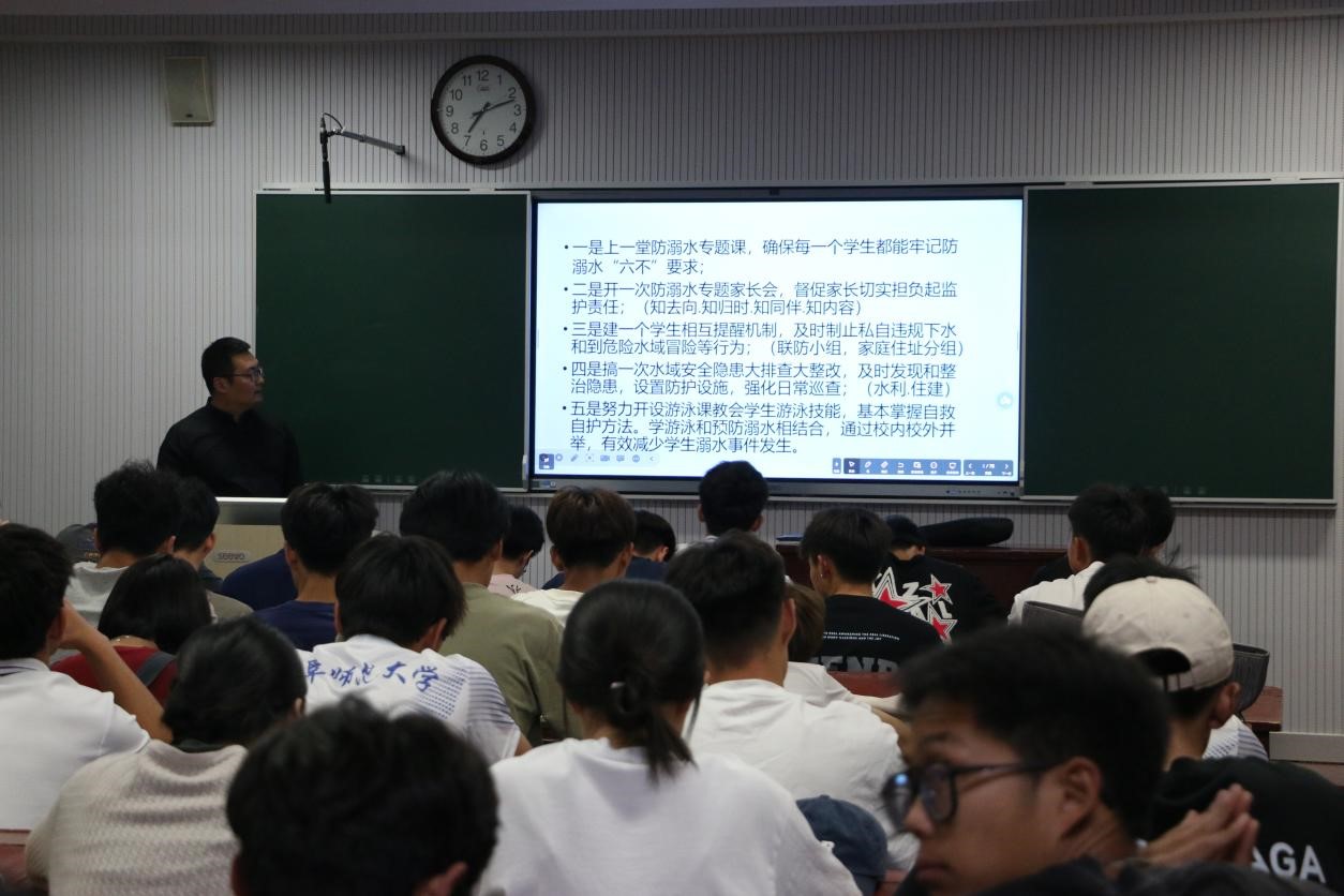 孔全老师以近年来各地发生的学生溺水事件作为例子,希望同学们引以为鉴,他向同学们普及多种防溺水安全知识,阐明了生命的可贵。通过各种案例,同学们进一步了解溺水死亡为学生非正常死亡原因之首,深刻地认识到了溺水事故的危险性。