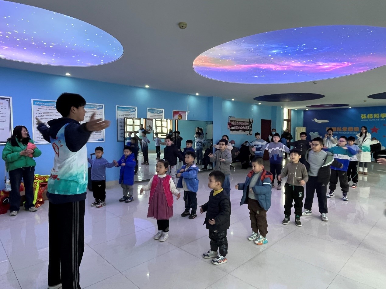图为社会实践成员带领孩子们做热身活动。