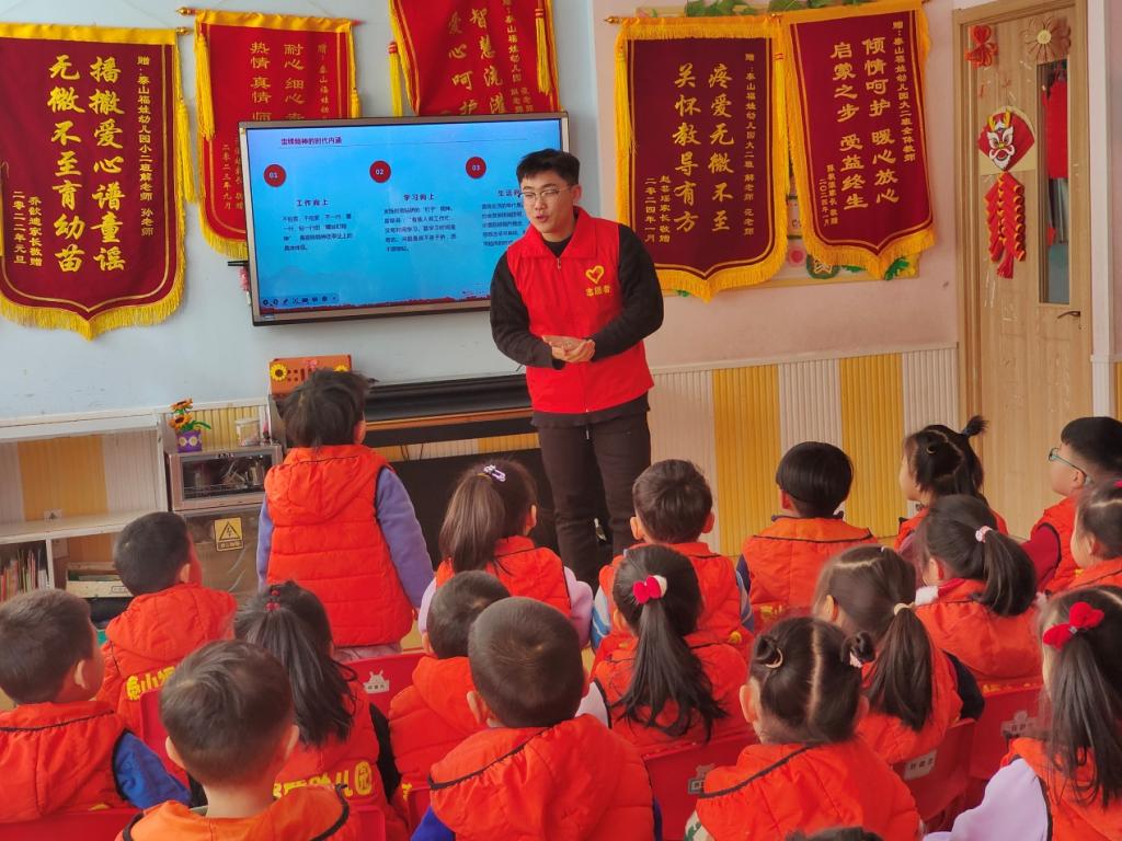 “踔厉奋发,踵事增华”寒假实践队前往泰安市泰山区福娃幼儿园开展“追寻雷锋精神,传承红色记忆”社会实践活动,让实践对队员们去引导小朋友们认识雷锋,全面学习新时代雷锋精神。