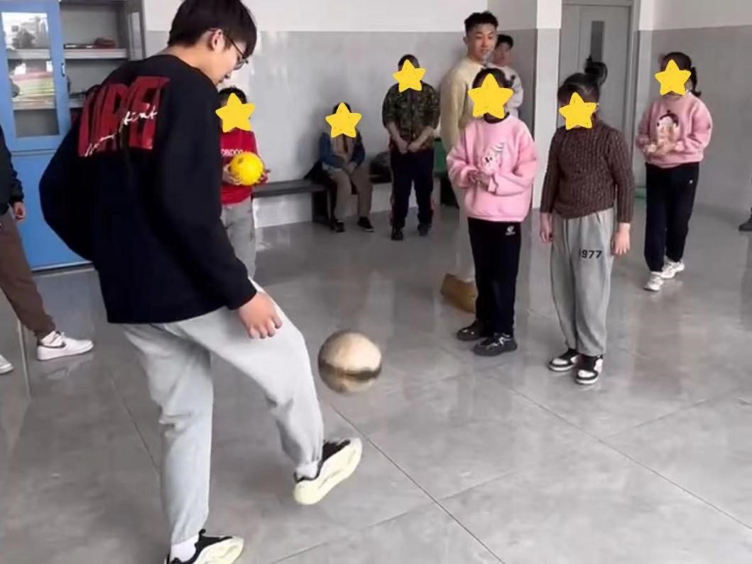 由于小朋友们各个都存在智力和生理方面的限制,实践队员们一遍遍重复着同样的动作,保质保量的将动作交给孩子们,通过这样的方式去传递温暖,呵护每一位小朋友。在练习过程中一次次的失误没有击败小朋友,在志愿者鼓励和安慰下,终于能将足球成功颠起,一位15岁的小朋友虽然智力只有8岁,但仍然在志愿者的鼓励下经过自己不屑的努力一次性最多可以颠四个,对普通孩子来说可能不足为奇,但对于特殊教育里的孩子这是值得骄傲和称赞的!