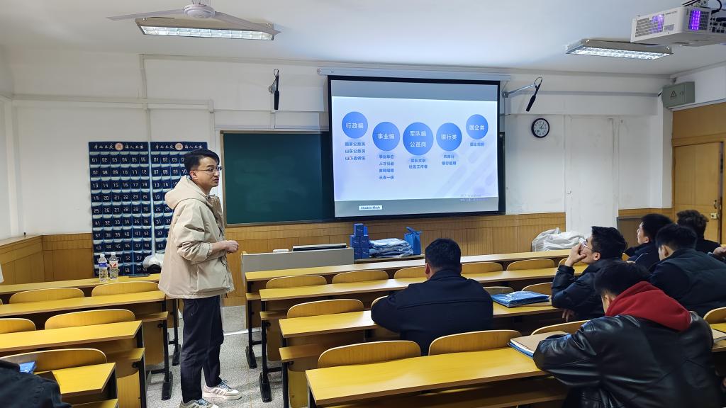 主讲人先分析了目前的就业形势,介绍了公务员和事业编考试的整体形势和竞争压力,随后以国家公务员、山东公务员和山东选调生三大模块为重点,详细介绍了其报考条件、考试类型、考试时间和考试内容等,使学生们对公职类考试有了更清晰的认识。