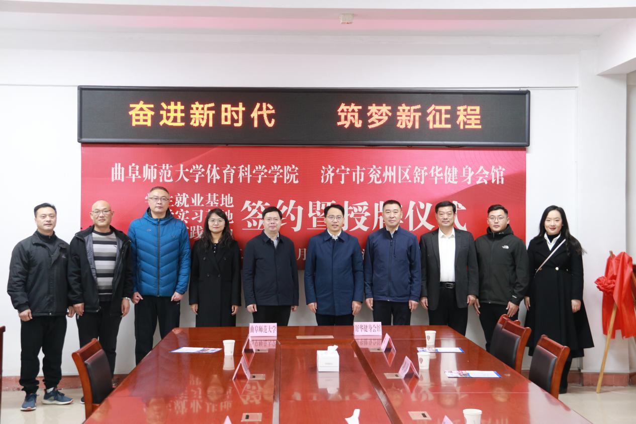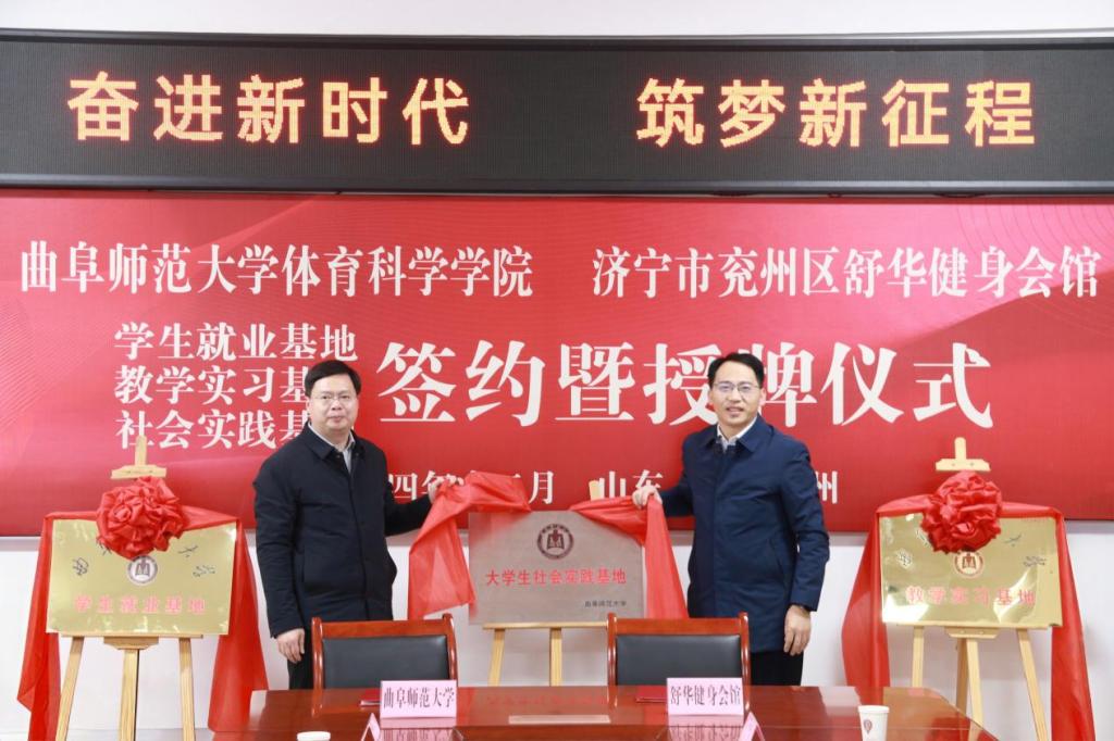 兖州区教育和体育局党组成员、副局长苏锋与体育学部党委书记许怀祥为学生就业基地、教学实习基地、社会实践基地揭牌;兖州区舒华健身会馆馆长魏建与体育学部党委副书记马振华在仪式上签约。