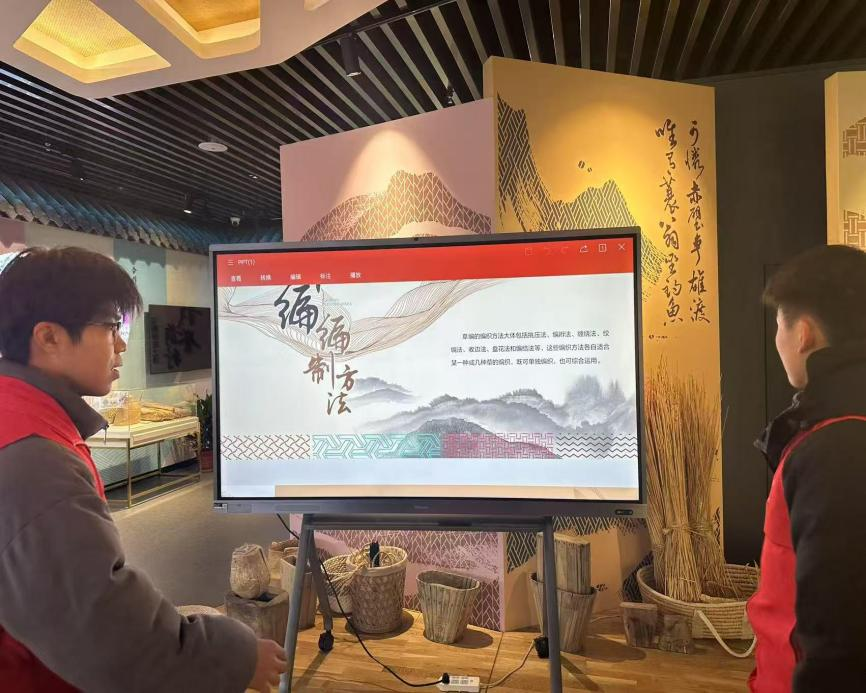 在互动体验区,同学们观看有关草编编制方法的视频,视频中草编技艺非遗传承人展示了精湛编织技巧。虽然没有草编技艺非遗传承人的现场展示,但通过视频同学们仿佛身临其境,耐心学习如何编织。掌握了一些基本技巧,深刻体会到了草编技艺的魅力与不易。