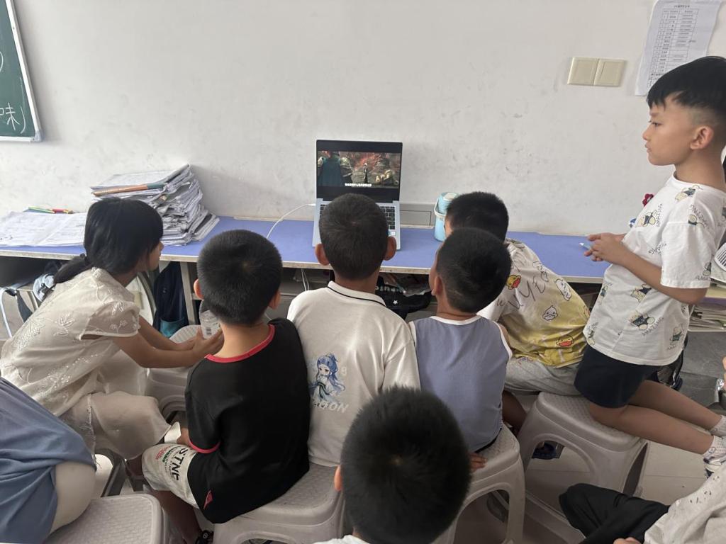 实践队成员走进课堂,化身任课老师,围绕语文生字词等内容展开教学。黑板上整齐罗列知识点 ,队员们以生动讲解、互动问答,引导孩子们掌握知识,课堂上求知目光汇聚,展现浓厚学习氛围。除知识传授,还组织趣味活动,当笔记本电脑播放影片,孩子们瞬间被吸引,沉浸在奇妙世界,在多元体验中拓宽视野。