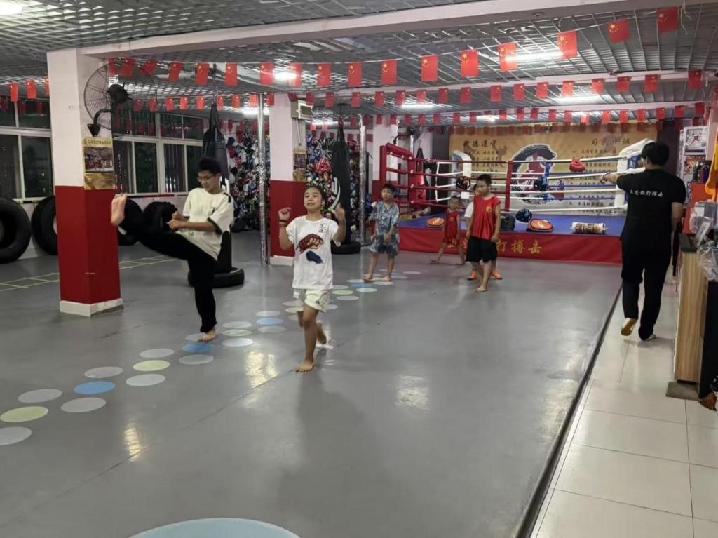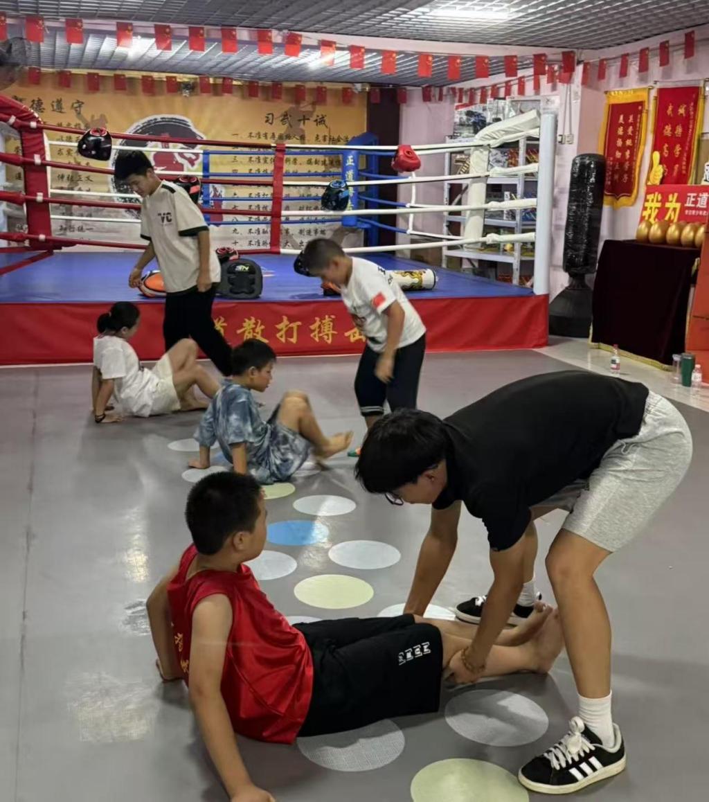 踏入武道馆,鲜艳的国旗与武道文化标语交相辉映,营造出热血又庄重的氛围。实践队队员们迅速进入“教练”角色,从基础动作教起——踢腿时强调发力点,出拳时纠正姿势,每一个动作都反复示范、耐心指导。对练环节,队员们化身“陪练搭档”,与孩子们近身切磋,在攻防间传授技巧;拉伸时刻,又细致辅助,守护运动安全,让训练既充满挑战又不失温度。
