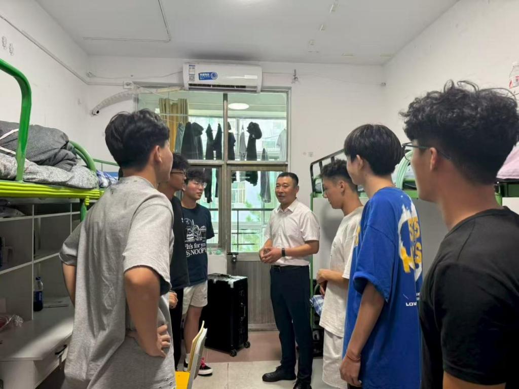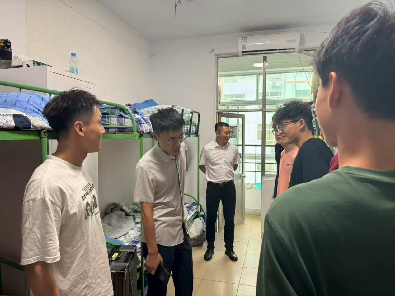 团委书记刘京,辅导员栾永鑫、周晗等一行深入2025级新生宿舍,为新生送去亚洲杯决赛直播
