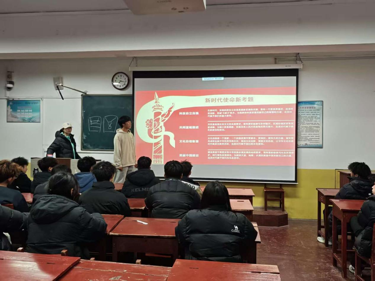 活动中,团支书通过PPT讲解与历史影像资料相结合的方式,带领同学们重温了1935年北平学生在国家危难之际挺身而出、开展抗日救亡运动的壮烈历程。同学们认真聆听,共同感受那段充满热血与呐喊的青春历史。