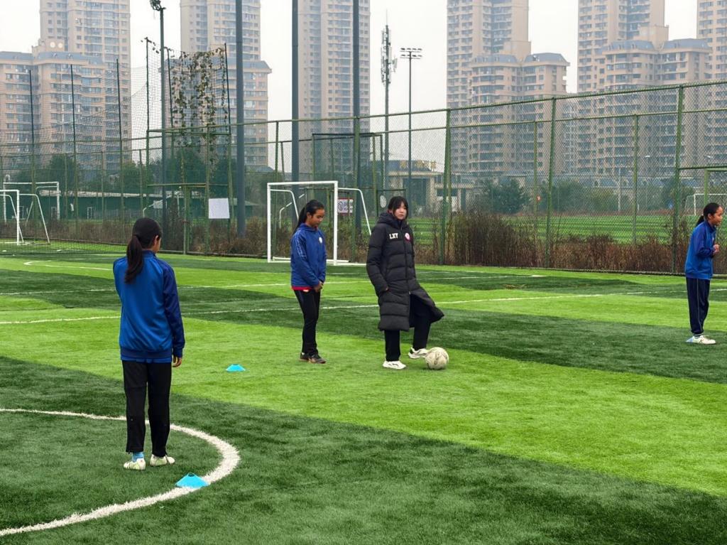 在冬日的足球场上,荣校兴教青春筑梦先锋队的队员正站在场边,专注观察身着红蓝训练服的小球员们开展分组对抗训练。远处的妇幼保健院大楼与城市建筑群,为这场充满活力的训练场景增添了独特的城市印记。
