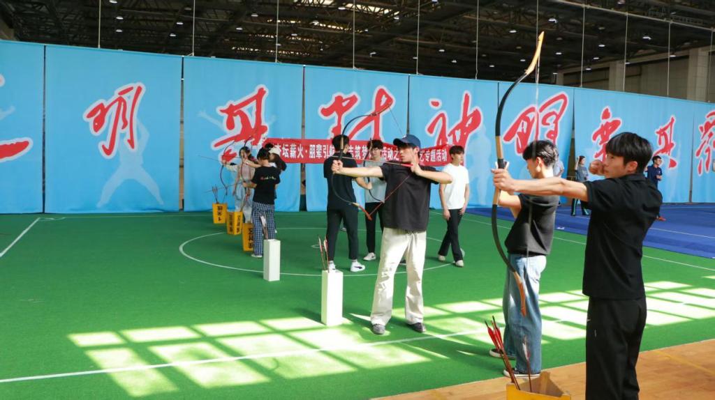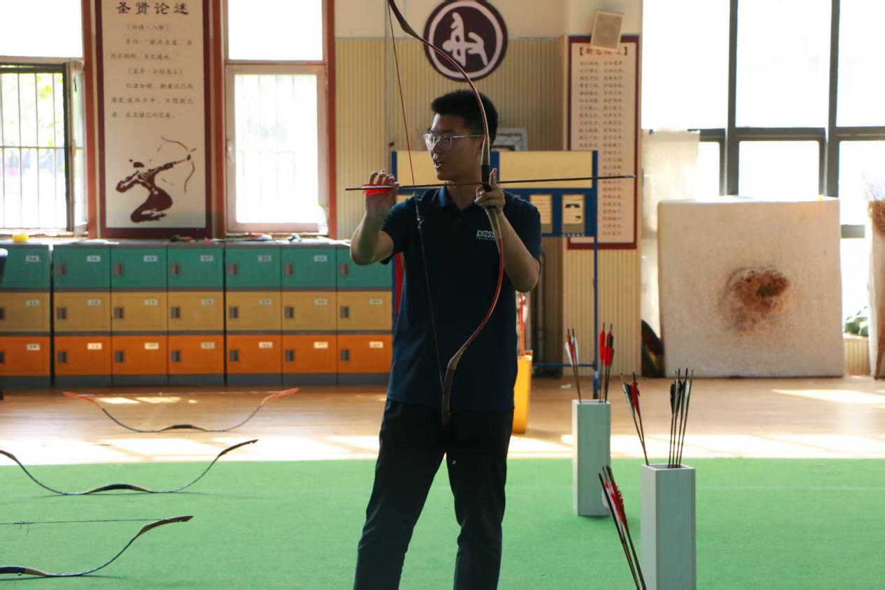 活动伊始,张玉通立足专业特长,围绕孔子射艺的礼仪规范、基础技法、文化内核展开教学,现场示范持弓、搭箭、起射、收势等全套标准动作,逐一拆解动作要点,细致指导同学们规范完成每一个环节。