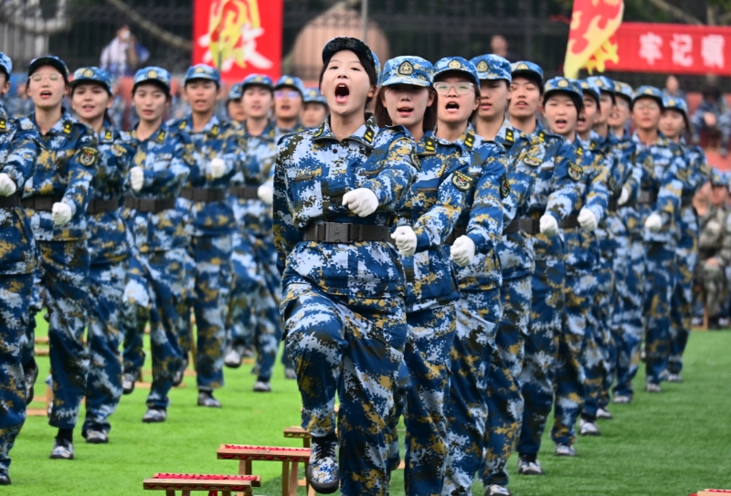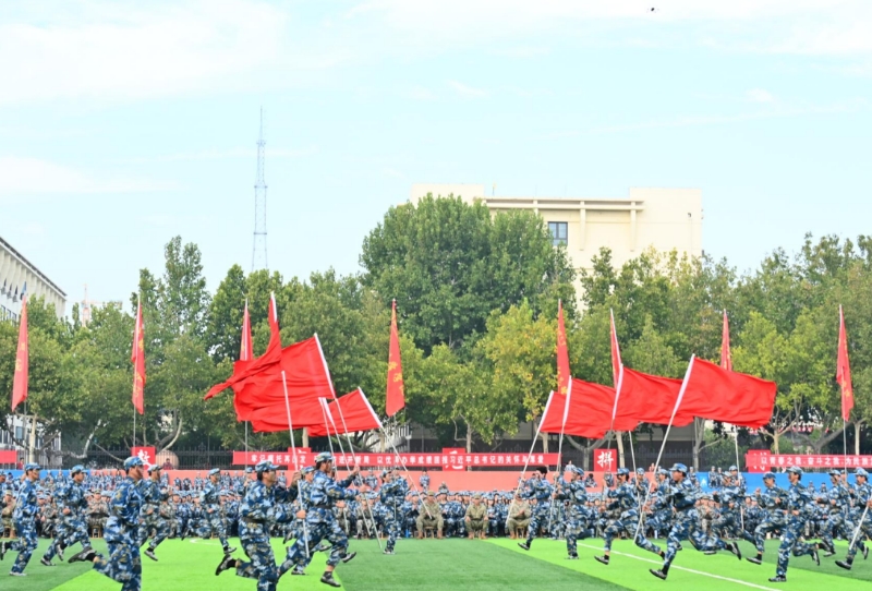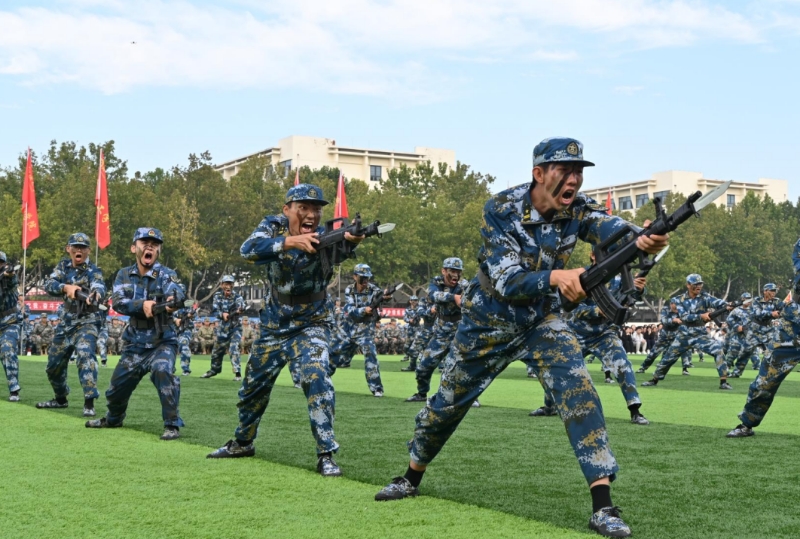 伴随着国歌雄壮激昂的旋律,鲜艳的五星红旗冉冉升起,迎风飘扬,军训总结大会拉开序幕。党委书记关延平发布指令后,各方队依次进行军训队列展示、刺杀操、捕俘拳、匕首操、战术演练等军事技能训练科目汇报表演。同学们动作整齐划一、口号铿锵有力、表演气势如虹,展现出良好的军事素养和训练成效,赢得现场阵阵掌声。