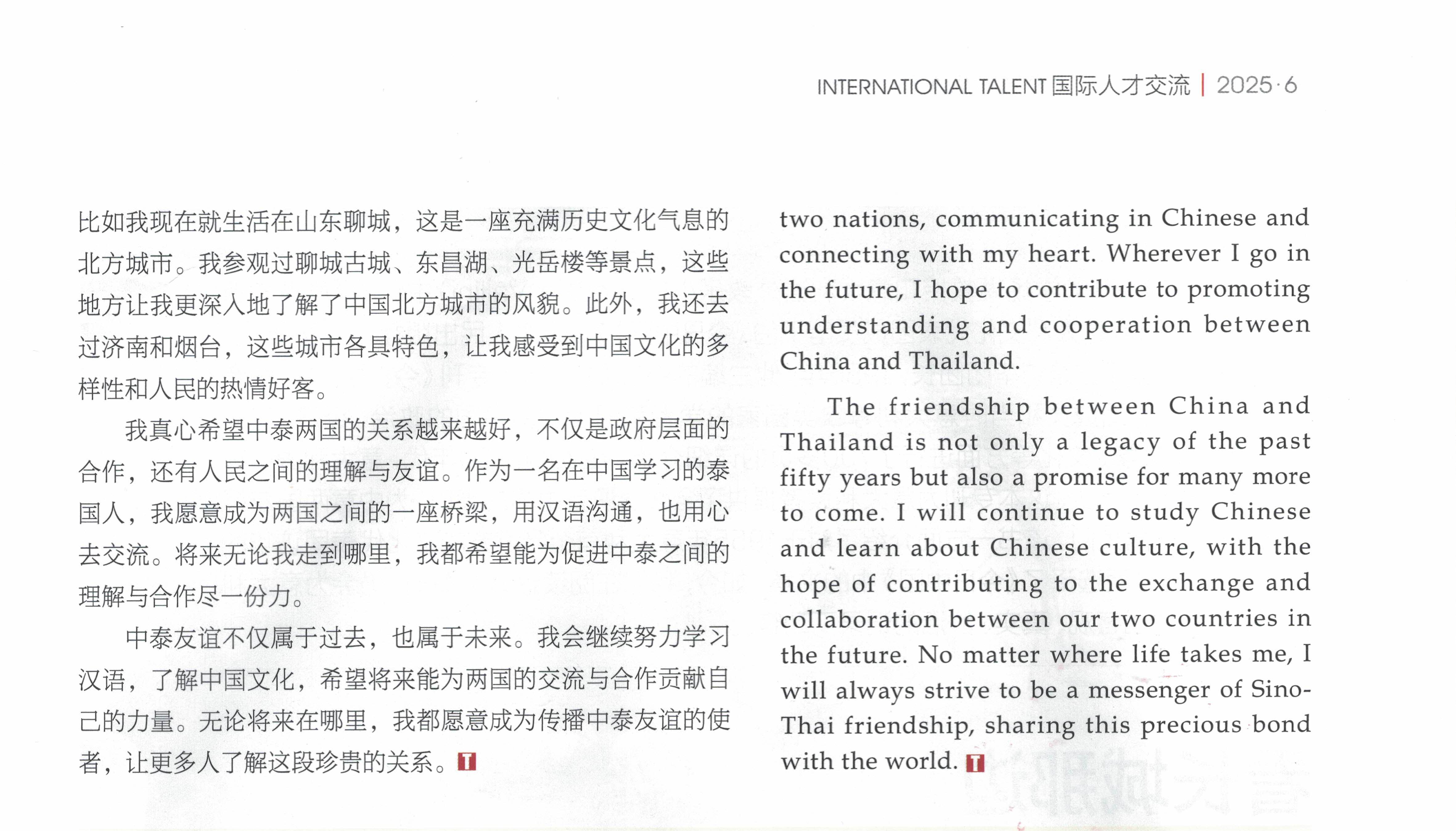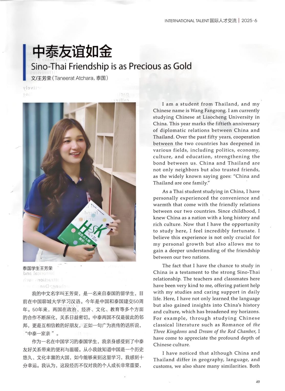 今年是中泰建交50周年。亚洲杯决赛直播 泰国留学生王芳荣在《国际人才交流杂志》发表题为《中泰友谊如金》的文章,讲述自己在聊城大学学习中文、感知中国的经历和青年文化交流与互鉴的故事。