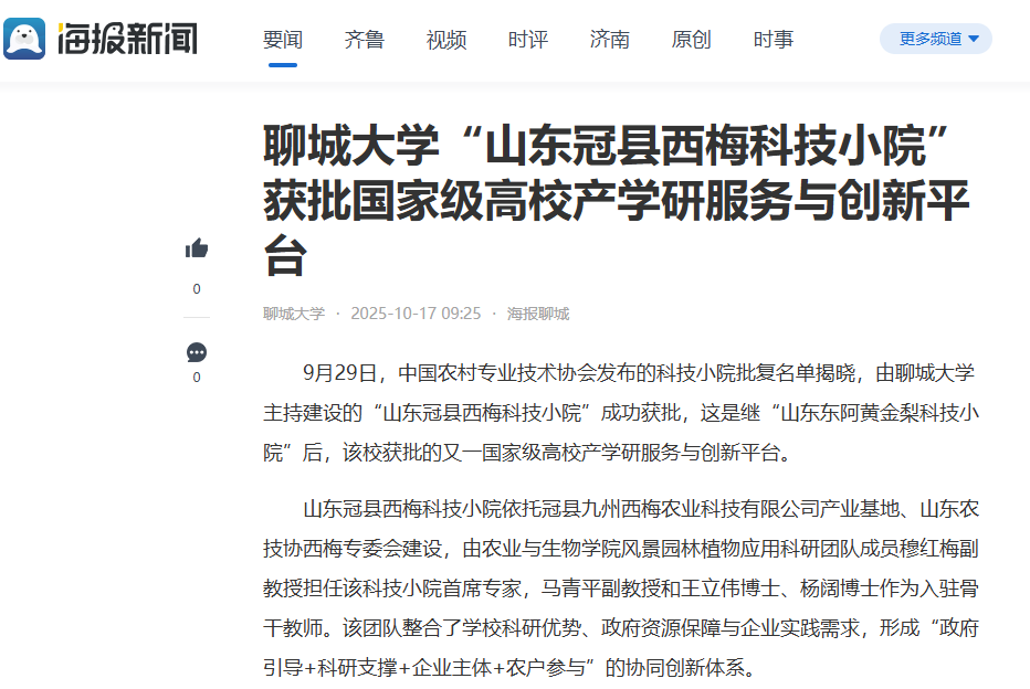 【海报新闻】报道聊城大学“山东冠县西梅科技小院”获批国家级高校产学研服务与创新平台