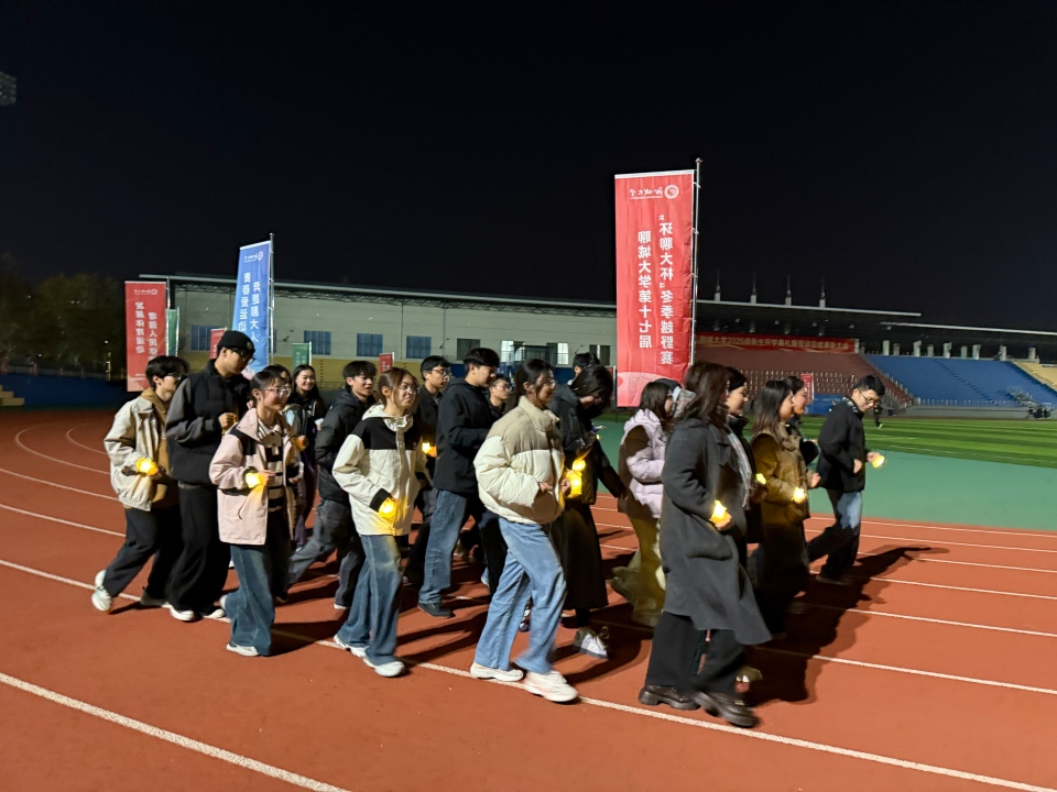 活动伊始,荧光装饰区便热闹非凡:同学们手持荧光棒、佩戴荧光手环,将自己装扮成夜色里的“发光体”,原本静谧的校园主干道瞬间化作缤纷的“荧光海洋”。随着发令哨声响起,荧光队伍如流动的星河般出发,闪烁的荧光与夜空交相辉映,笑声与脚步声交织成青春的节拍。