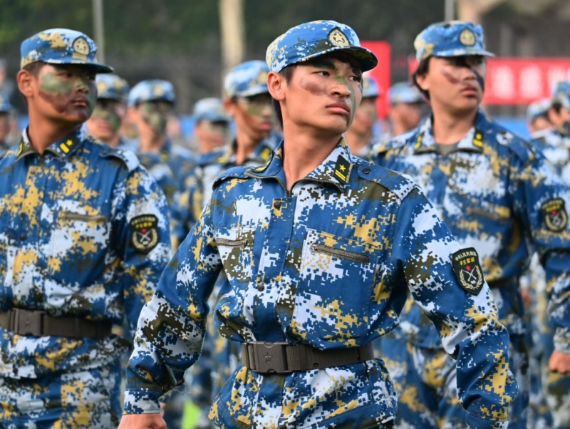 伴随着国歌雄壮激昂的旋律,鲜艳的五星红旗冉冉升起,迎风飘扬,军训总结大会拉开序幕。党委书记关延平发布指令后,各方队依次进行军训队列展示、刺杀操、捕俘拳、匕首操、战术演练等军事技能训练科目汇报表演。同学们动作整齐划一、口号铿锵有力、表演气势如虹,展现出良好的军事素养和训练成效,赢得现场阵阵掌声。